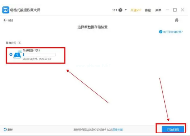 2、 然后選擇原數(shù)據(jù)文件所存儲(chǔ)的位置,此處可直接選擇對(duì)應(yīng)誤刪數(shù)據(jù)的U盤(pán),選好點(diǎn)擊“開(kāi)始掃描“按鈕;
