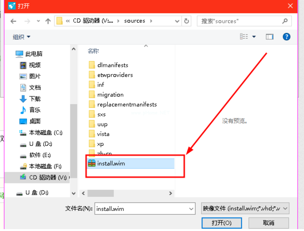 4、在WTG輔助工具當(dāng)中,接著瀏覽選擇虛擬光驅(qū)中 sources 文件夾中的 install.wim。