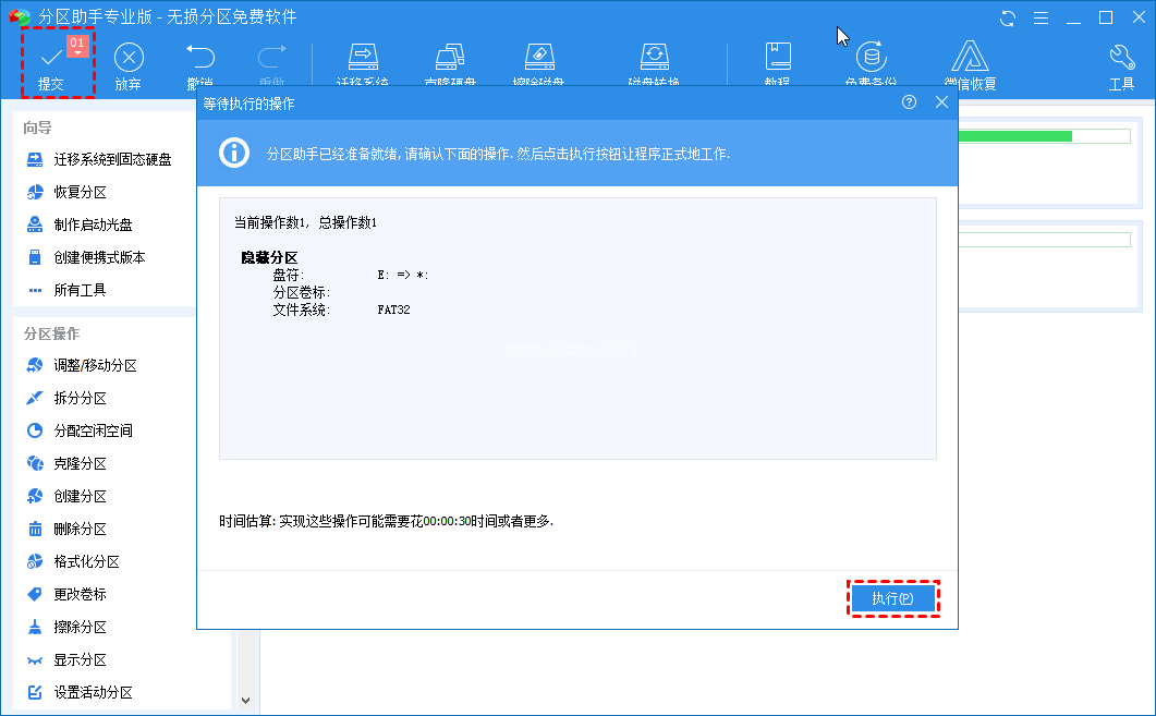 3. 返回主頁界面,點(diǎn)擊“提交”查看預(yù)覽,確認(rèn)無誤后點(diǎn)擊“執(zhí)行”開始隱藏U盤分區(qū)即可。