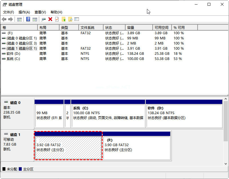 5. 返回磁盤管理主的頁面,就可以看到該U盤分區(qū)已經(jīng)沒有盤符了,成功隱藏U盤分區(qū)。