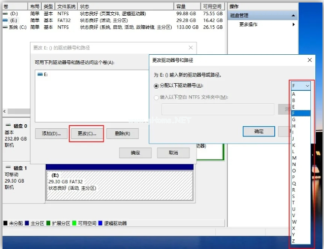 2、在彈出的窗口界面中點(diǎn)擊「更改」,選擇一個(gè)未被占用的盤(pán)符,點(diǎn)擊確定,這樣電腦就會(huì)重新識(shí)別U盤(pán)并安裝相關(guān)驅(qū)動(dòng)啦。