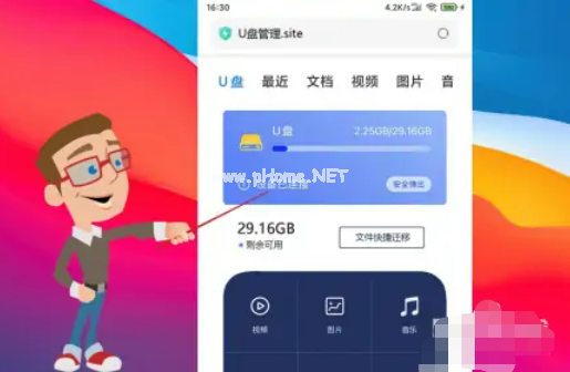 在百度上找到U盤管理工具,下載安裝到手機(jī)上,進(jìn)入U(xiǎn)盤管理以后,選擇文件快捷遷移;