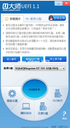 1、首先打開安裝好的U大師U盤啟動(dòng)制作工具,插入U(xiǎn)盤,點(diǎn)擊ISO制作就可以看到iso制作中,我們耐心等候即可。