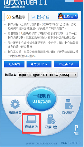 4、然后我們回到U大師U盤啟動(dòng)制作工具,點(diǎn)擊模擬啟動(dòng)選項(xiàng)。