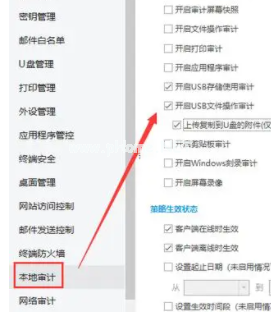 5.選擇完成后我們點(diǎn)擊確定,在功能列表左側(cè)找到本地審計(jì),然后選擇開(kāi)啟usb存儲(chǔ)使用審計(jì)和usb文件操作審計(jì),就能夠?qū)T工電腦插入的U盤(pán)使用及文件操作進(jìn)行記錄了。
