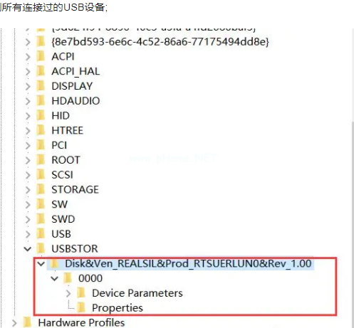 5.依次點(diǎn)擊并展開(kāi)注冊(cè)表項(xiàng)ControlSet001\Enum\USBSTOR,在下面就可以看到所有連接過(guò)的USB設(shè)備。