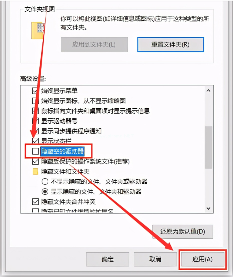 2.接著在文件夾選項(xiàng)界面,點(diǎn)擊「查看」,取消勾選「隱藏空的驅(qū)動(dòng)器」這個(gè)選項(xiàng),最后點(diǎn)擊「應(yīng)用」。