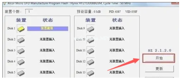 4.接下來,我們根據(jù)主控芯片的類型,下載與之相對應(yīng)的量產(chǎn)工具后,在其運(yùn)行界面中,插入U盤并點擊“開始”按鈕,即可完成U盤的低級格式化操作。