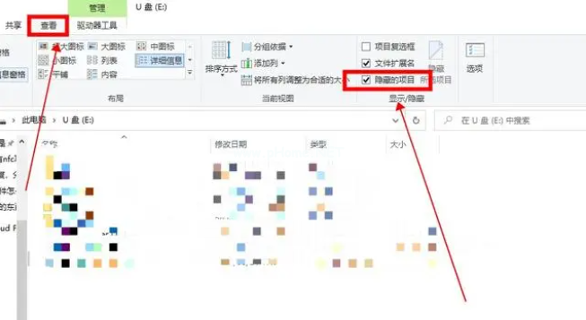 3、接著在菜單欄上點(diǎn)擊“查看”選項卡,勾選“隱藏的項目”選項恢復(fù)隱藏的文件即可找回u盤數(shù)據(jù)。