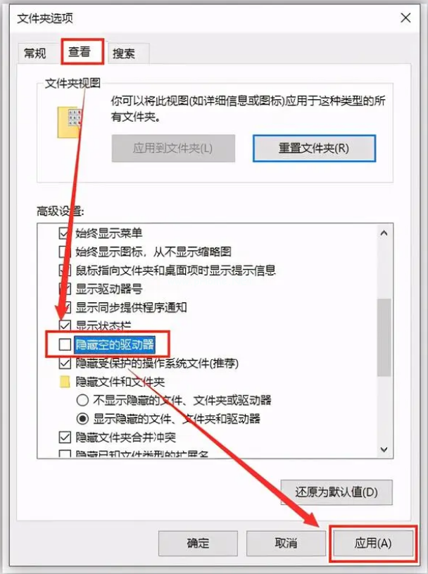 2、打開文件夾選項界面之后,點(diǎn)擊切換查看選項卡,取消勾選“隱藏空的驅(qū)動器”,點(diǎn)擊“應(yīng)用”即可解決。