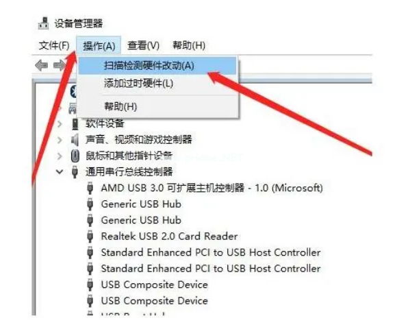 5、鼠標(biāo)再點(diǎn)擊“操作”-“掃描檢測硬件改動”;