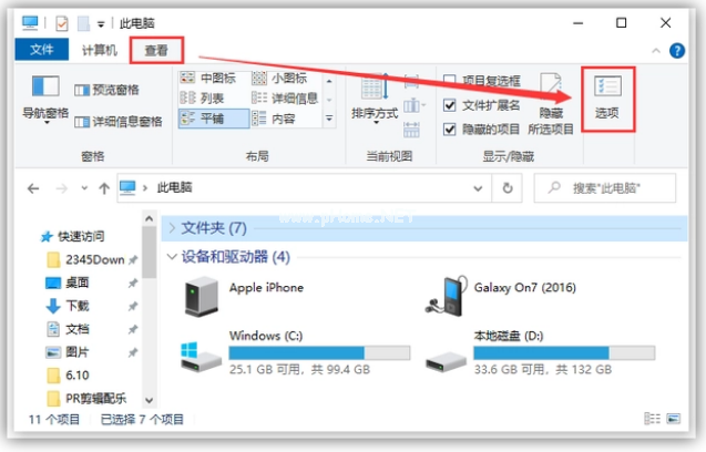 1、首先將U盤插入電腦,依次點(diǎn)擊此電腦-查看-選項;