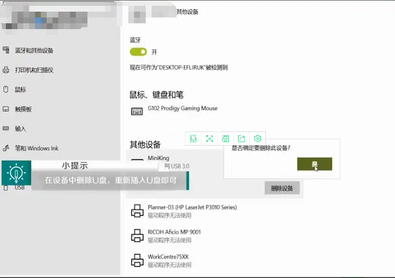 2、刪除設(shè)備,重新插入U盤即可修復。