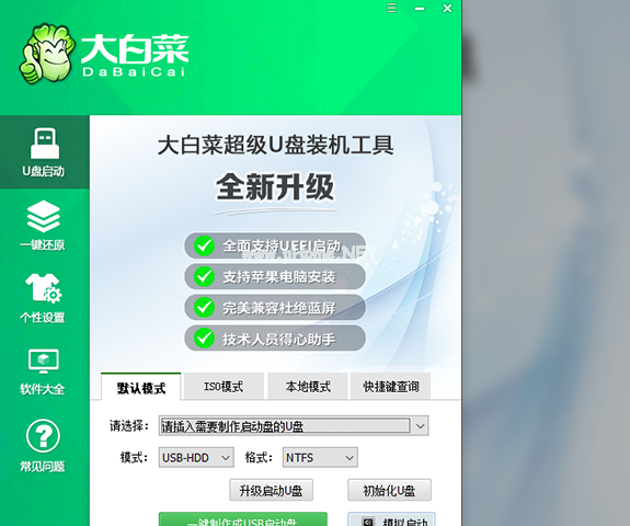 大白菜超級U盤啟動盤制作工具這是最近新興的系統(tǒng)軟件,但是因為它操作便利深受血很多小伙伴喜愛,100%的啟動U盤制作成功率,啟動U盤制作速度相比更加的快速。其PE系統(tǒng)安裝后擁有極速啟動功能,而且還擁有萬能U盤的啟動文件等等功能,通過精心優(yōu)化的PE系統(tǒng)更加精致,更加適用各大粉絲,這款軟件安全性也很好,大家可以放心使用。