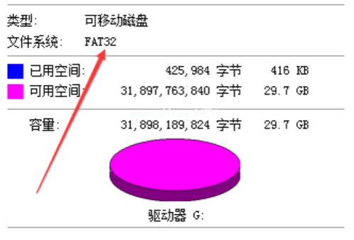2、接著將“右鍵”電腦上新加的磁盤—>選擇“屬性”,即可查看詳細(xì)信息,發(fā)現(xiàn)其文件系統(tǒng)為FAT32,是不可以傳輸單個大于4GB的文件。