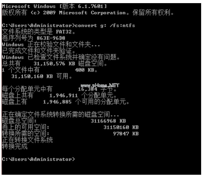 4、此時就可以看到打開了一個這樣的頁面,輸入convert "U盤編號": /fs:ntfsconvert g: /fs:ntfs #命令當(dāng)中的g為你硬盤的編號名,如C,D,E。之后會對你的U盤文件系統(tǒng)進(jìn)行轉(zhuǎn)換,大家耐心等待轉(zhuǎn)換完成就可以了。