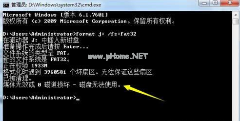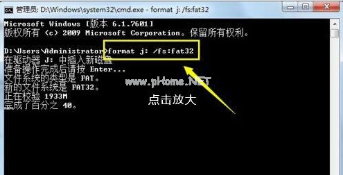 2、然后輸入“format j: /fs:fat32”(其中j代表U盤所在盤符)并按回車鍵執(zhí)行U盤格式化的操作。