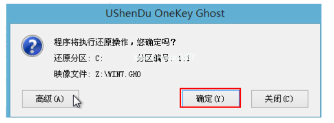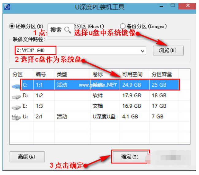 2、進(jìn)入到pe系統(tǒng)之后,會(huì)自動(dòng)啟動(dòng)U深度pe裝機(jī)工具,之后點(diǎn)擊瀏覽選擇win7,之后選擇系統(tǒng)盤,再點(diǎn)擊確定。