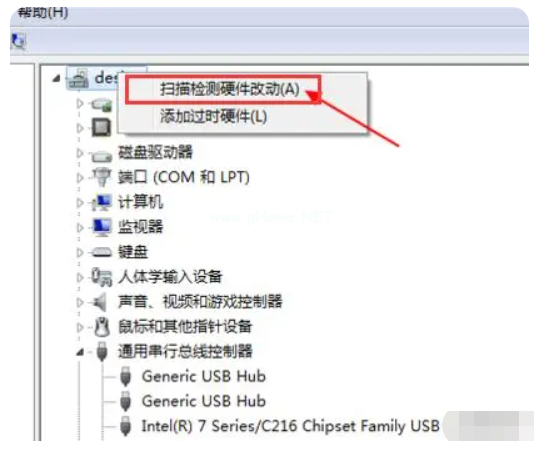 5.卸載完成后再右擊選擇計(jì)算機(jī)名,選擇“掃描檢測硬件改動”即可。