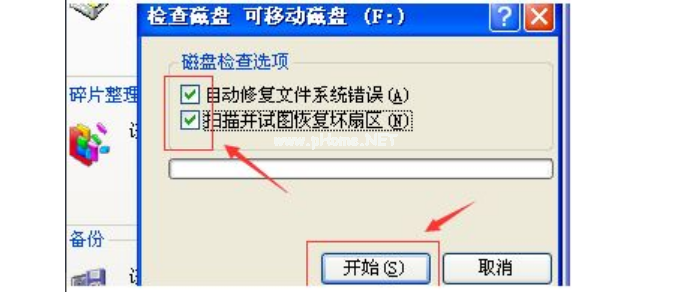 第四、勾選【自動修復(fù)文件系統(tǒng)錯誤】【掃描并嘗試修復(fù)壞扇區(qū)】,點(diǎn)擊【開始】。