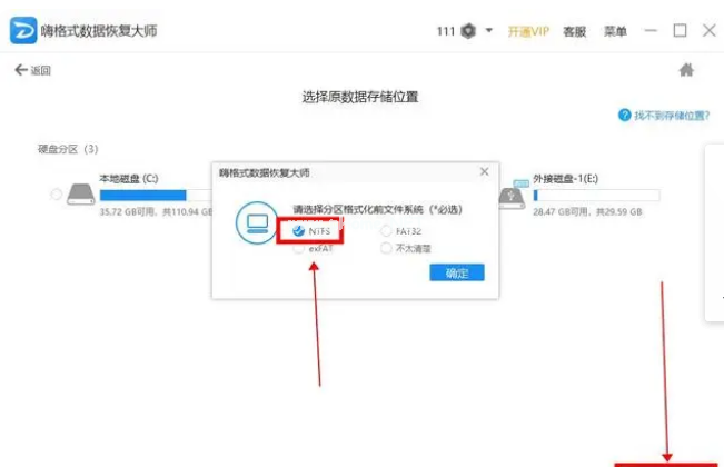 3、在彈出窗口中點(diǎn)擊分區(qū)格式化前的文件系統(tǒng)并確定,選擇好后點(diǎn)擊“開始掃描”。