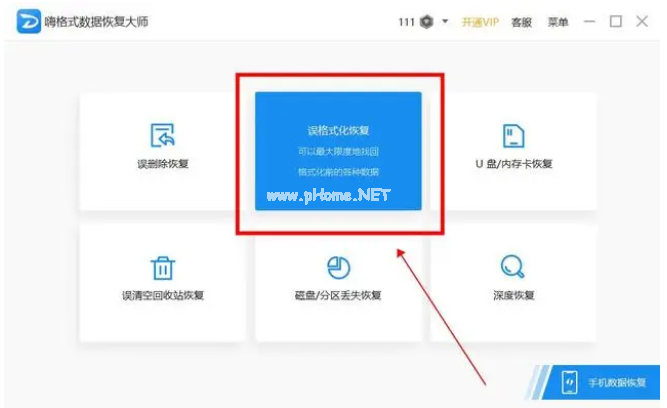 1、運(yùn)行電腦上安裝好的【嗨格式數(shù)據(jù)恢復(fù)大師】軟件,軟件主頁上有六個(gè)恢復(fù)模式,這里需要點(diǎn)擊“誤格式化恢復(fù)”模式。