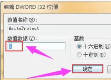 5、雙擊打開(kāi)WriteProtect,把數(shù)值數(shù)據(jù)改為“0”,點(diǎn)擊“確定”選項(xiàng)。