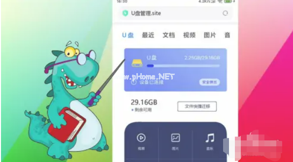 然后我們就可以通過手機(jī)看到U盤存儲(chǔ)情況及音樂,圖片,文件等信息;