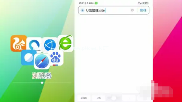 先打開手機(jī)瀏覽后在頂部網(wǎng)址輸入欄目輸入:U盤管理.site【點(diǎn)擊輸入法上的回車鍵進(jìn)入U(xiǎn)盤管理】;