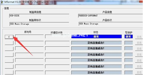 4、確保在U盤插入電腦USB接口的前下,程序?qū)棾鋈鐖D所示的“U盤修復(fù)”界面中,當(dāng)U盤被正常識別后,點(diǎn)擊對應(yīng)項(xiàng)左側(cè)的“C”按鈕即可進(jìn)入自動修復(fù)過程。