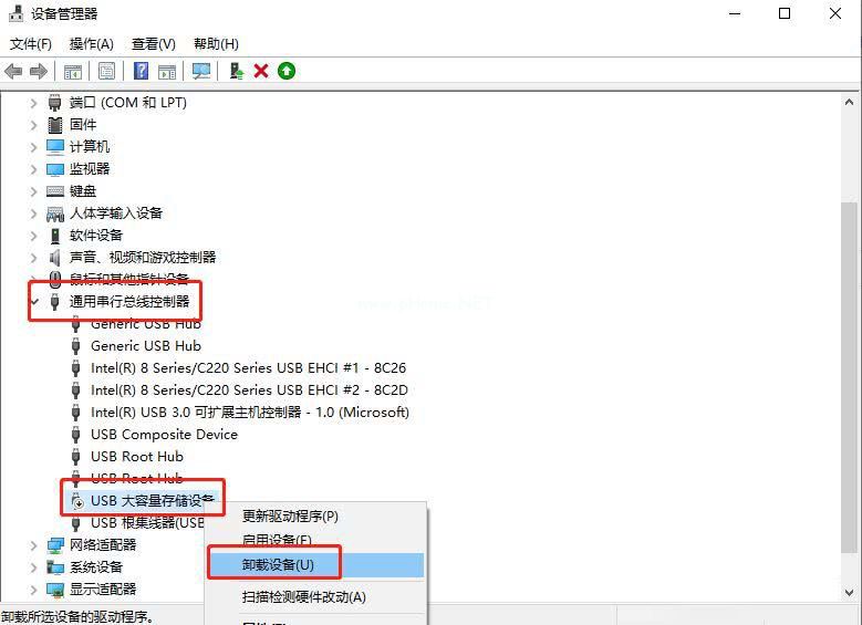 2、選擇“通用串行總線控制器”,右鍵“USB大容量存儲設(shè)備”,選擇“卸載設(shè)備”,重啟電腦,系統(tǒng)自動重新識別驅(qū)動。