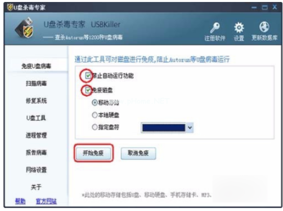 2.選擇免疫U盤病毒模式,勾選防止自動(dòng)運(yùn)行功能和免疫功能。點(diǎn)擊開始免疫。