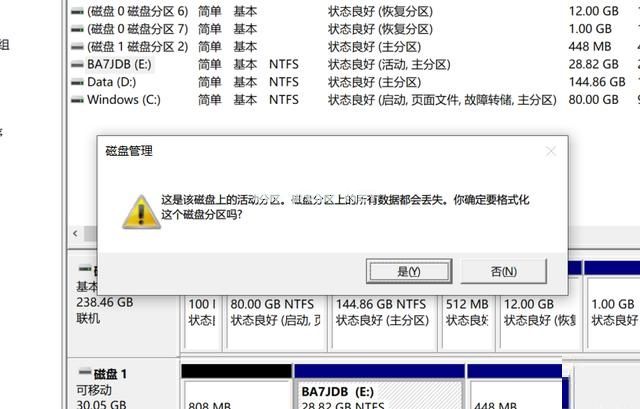 4、在彈出的對(duì)話框 磁盤(pán)管理 ,這是該磁盤(pán)上的活動(dòng)分區(qū),磁盤(pán)分區(qū)上的所有數(shù)據(jù)都會(huì)丟失,你確定要格式化這個(gè)磁盤(pán)分區(qū)嗎?點(diǎn)擊是,即可格式化磁盤(pán)。反之不做任何操作。