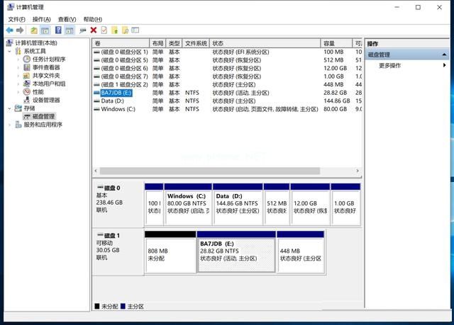 2、在打開(kāi)的 計(jì)算機(jī)管理 對(duì)話欄中,依次打開(kāi) 計(jì)算機(jī)管理(本地)》存儲(chǔ)》磁盤(pán)管理,雙擊 磁盤(pán)管理 然后在右邊找到相應(yīng)的E盤(pán)。