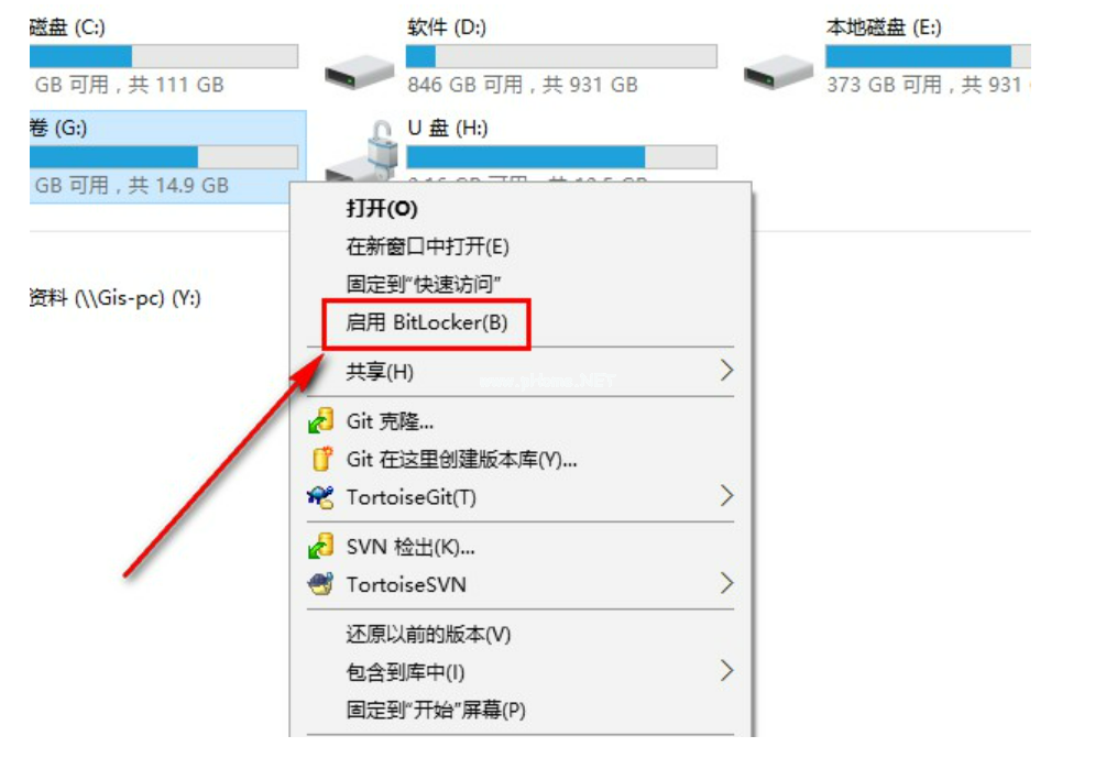1、插入u盤到電腦usb接口,顯示出u盤后,右鍵選擇u盤,點(diǎn)擊“啟用BitLocker”。