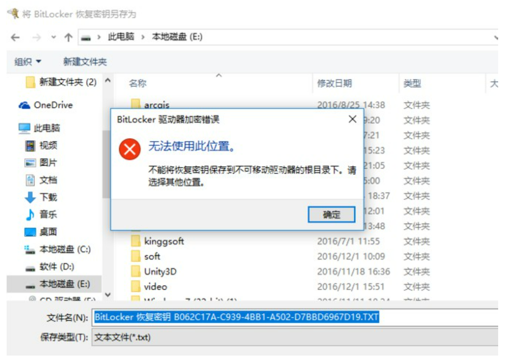 4、不能把恢復(fù)密鑰保存在非移動(dòng)驅(qū)動(dòng)器的根目錄,也不能保存在已加密的移動(dòng)磁盤里。