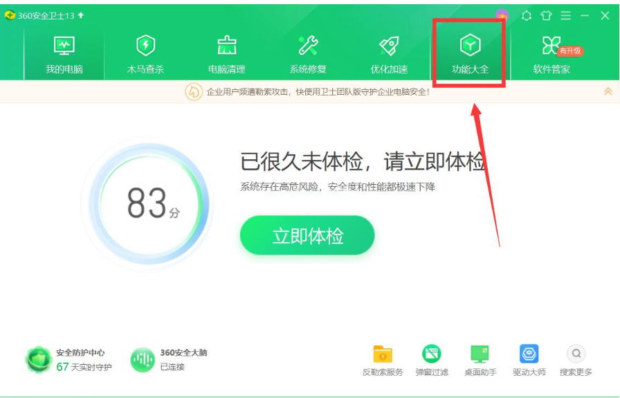 1、將需要恢復(fù)數(shù)據(jù)的u盤插入電腦中,運(yùn)行軟件操作界面,點(diǎn)擊上方的“功能大全”。