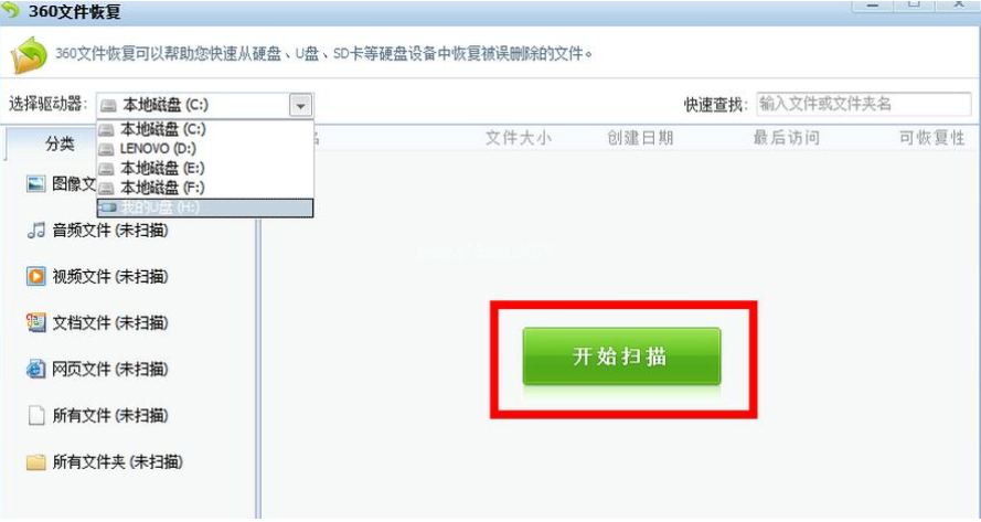 2、選擇u盤內(nèi)存卡恢復(fù),點(diǎn)擊開始掃描。