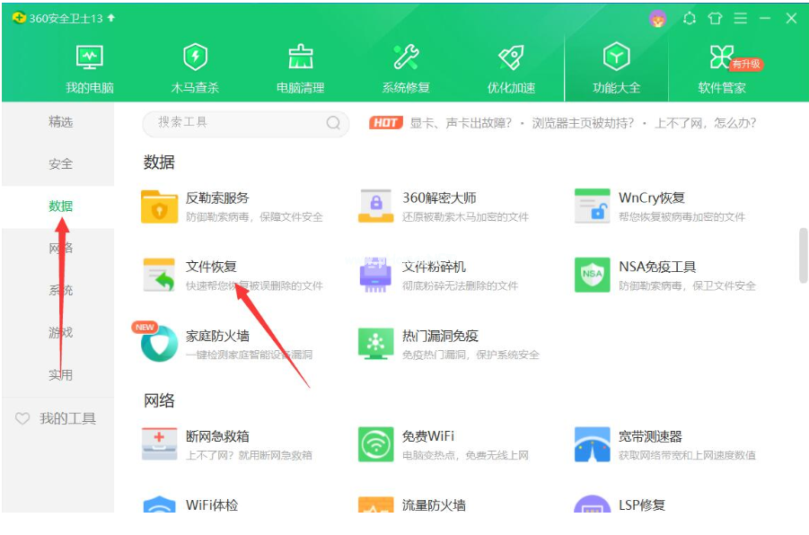 2、然后點(diǎn)擊“數(shù)據(jù)”,選擇其中的“文件恢復(fù)”。