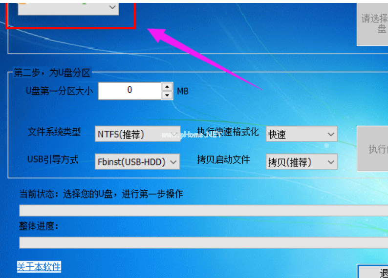 2、在U盤一欄中選擇要進(jìn)行分區(qū)的U盤。