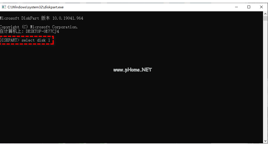 3、再輸入“select disk 1”后按“回車”。(本機(jī)硬盤為0,在沒有其他硬盤的情況下,U盤為硬盤1,如果不確定,可以輸入“l(fā)ist disk”查看盤符。)