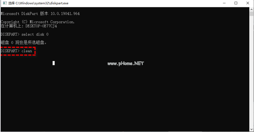 4、選擇完成后,繼續(xù)輸入命令“clean”刪除U盤上的所有數(shù)據(jù),如有重要數(shù)據(jù),請?zhí)崆皞浞荨?/p>
