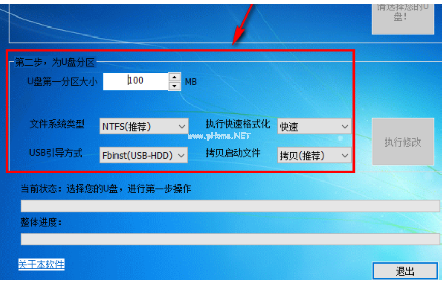 3、進(jìn)入第二步,為U盤分區(qū),其能夠支持設(shè)置第一分區(qū)大小,文件系統(tǒng)類型、執(zhí)行快速格式化、USB引導(dǎo)方式等參數(shù)。