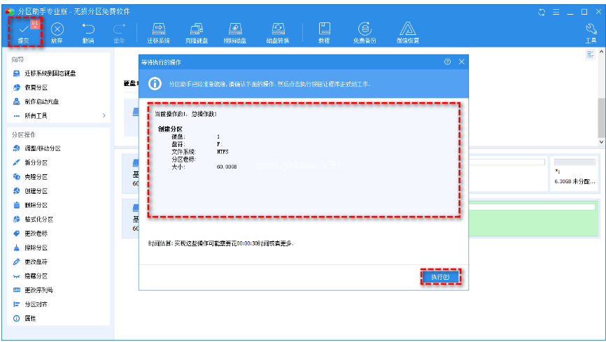 4、點(diǎn)擊左上角的“提交”查看將要進(jìn)行的操作,確認(rèn)無誤后點(diǎn)擊“執(zhí)行”等待完成即可。