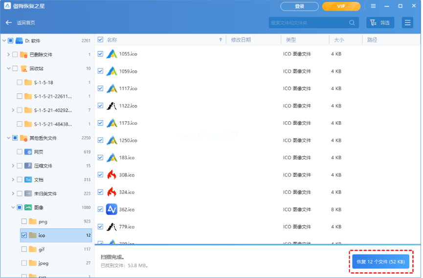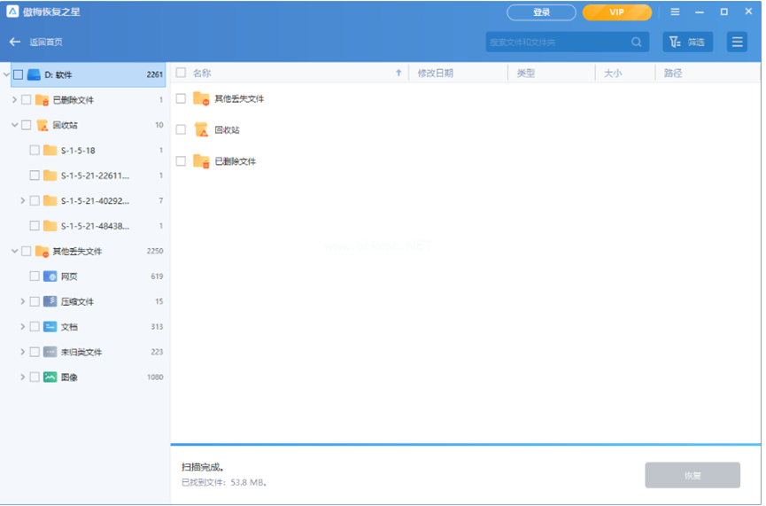 3、數(shù)據(jù)掃描完成后,選擇需要恢復(fù)的文件,點擊下面的“恢復(fù)”。