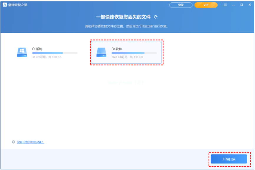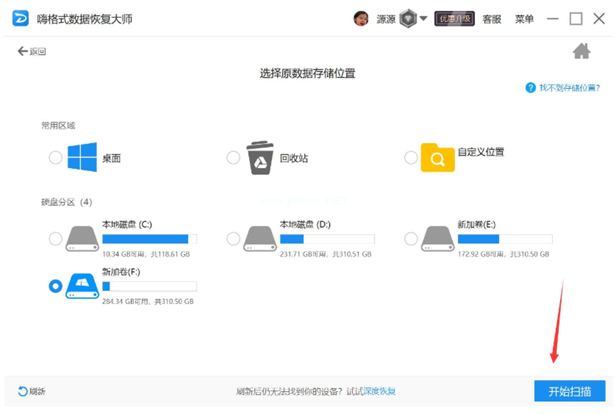 2、然后選擇原文件的存儲位置,選好點擊“開始掃描”。