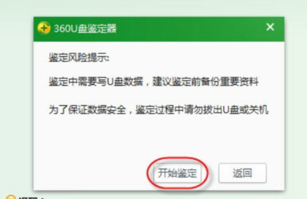 2、鑒定前彈出“鑒定風(fēng)險(xiǎn)提示”對(duì)話框,建議先對(duì)U盤(pán)數(shù)據(jù)備份后,才去鑒定U盤(pán),此處點(diǎn)擊“開(kāi)始鑒定”按鈕。