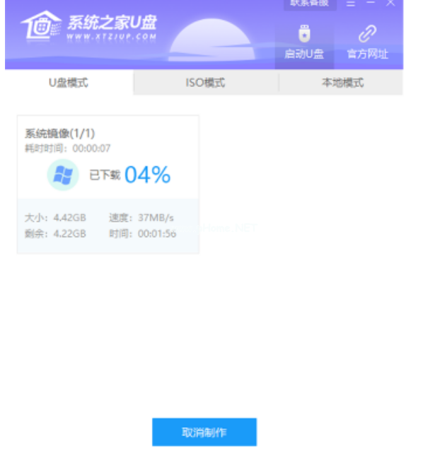 5、接下來系統(tǒng)之家U盤會(huì)開始進(jìn)行系統(tǒng)的下載,同時(shí),若想換一個(gè)系統(tǒng)下載,則可以點(diǎn)擊取消制作,進(jìn)行更換。