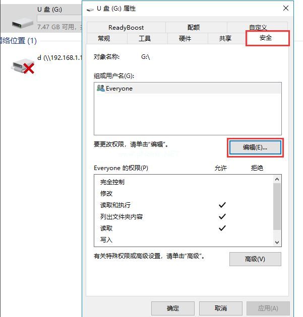 3、在打開(kāi)的窗口選everyone,然后在下方everyone的權(quán)限中勾選完全控制,最后依次點(diǎn)擊確定即可。