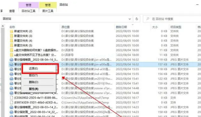 2、選中文件之后,右鍵文件點擊“還原”,這樣就可以將文件恢復到原來的位置。